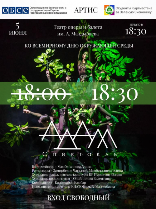 Во благо сохранения природного наследия, развития экологической культуры, созданию образов экологической устойчивости, а также в соответствии с Указом Президента Кыргызской Республики “Об объявлении Года защиты горных экосистем и климатической устойчивости”, инициативная группы “АРТИС”, молодежная общественная организация “Студенты Кыргызстана за Зелёную Экономику” и Кыргызский национальный академический театр оперы и балета им. А. Малдыбаева при поддержке Программного офиса ОБСЕ организуют балетную постановку под названием “АДАМ”. Постановка посвящена раскрытию проблем взаимоотношений человека, общества и природы и представляет собой пример творческого подхода к повышению уровня информированности населения о климатических рисках.