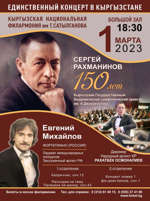 Концертом «150 лет гению» Государственный академический симфонический оркестр имени А.Джумахматова отметит полутора вековой юбилей уникального таланта мировой музыки Сергея Рахманинова 1 марта в Большом зале Кыргызской Национальной филармонии.