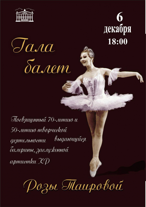 ГАЛА-БАЛЕТ, посвященный 70-летию и 50-летию творческой деятельности выдающейся балерины, заслуженной артистки Кыргызской Республики Розы Таировой пройдет 6 декабря в 18.00 в Кыргызском национальном академическом театре оперы и балета имени А.Малдыбаева.