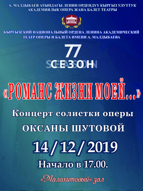 14 декабря в обновленном «Малахитовом» зале Кыргызского театра оперы и балета имени А.Малдыбаева состоится концерт солистки оперы Оксаны Шутовой «Романс жизни моей…».