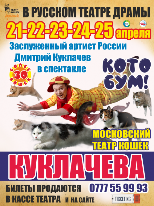 Впервые в Кыргызстане! Единственный в мире! Легендарный Московский театр кошек Куклачева в Бишкеке!!! Заслуженный артист России Дмитрий Куклачев и его пушистые артисты представляют спектакль «КОТОБУМ».