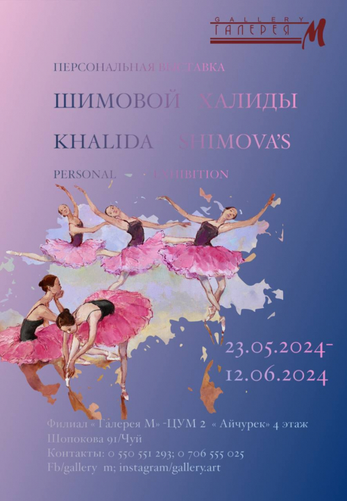 29 апреля «Галерея М» откроет бишкекчанам и гостям столицы необъятный мир творчества замечательной художницы Халиды Шимовой. На персональной выставке Халида Шимова представит 50 новых живописных широкоформатных полотен, выполненных в техниках масляной живописи и живописи на шелке (тушь, акварель, акрил).
