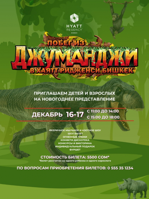 «Джуманджи». Компьютерная реальность и африканские мотивы, жаркие танцы и самые популярные герои. Одним словом, настоящая атмосфера произведения «Джуманджи» вас ожидает в отеле Хаят. Свет, декорации, артисты, спецэффекты, вкусное изысканное угощение и, конечно, роскошные подарки.
