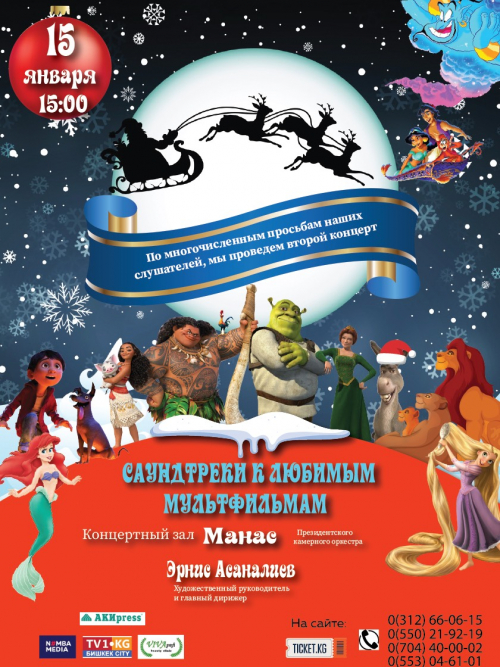 По многочисленным просьбам наших слушателей Президентский камерный оркестр «Манас» приглашает своих маленьких зрителей и их родителей на повторный концерт, который состоится 15 января 2022-года в 15-00 часов в концертном зале «Манас» (Киевская 96 А/Раззакова).