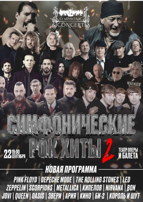 Театр Оперы и Балета "СИМФОНИЧЕСКИЕ РОК-ХИТЫ 2". Возвращаемся с новой программой! По многочисленным просьбам! В программе концерта РУССКИЕ РОК-ХИТЫ! Лучшие композиции группы "КИНО", "Звери", "Би-2", "Король и ШУТ", Кипелова и мн.др. А также Культовые хиты Мирового рока из репертуара Queen, Bon Jovi, Scorpions, LinkinPark, Nirvana, Pink и других культовых музыкантов прозвучат в исполнении симфонического оркестра. Вас ждут Рок-хиты, Симфонический оркестр и непередаваемые эмоции!
