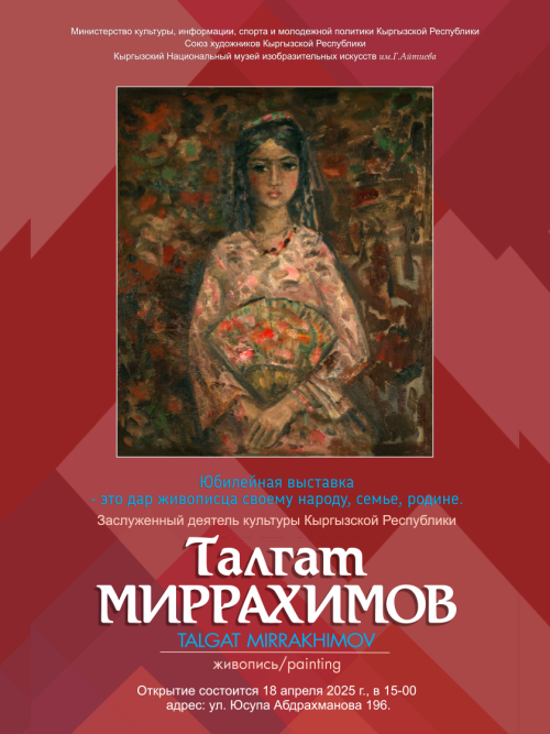 Не пропустите выставку художника, творчество которого удостоено международного признания и отмечено наградами в ряде стран! Его произведения были представлены на выставках в Центральном доме художника в Москве, а также в Люксембурге, Германии, Бельгии, Турции, Франции и странах Центральной Азии. Картины художника хранятся в художественных музеях Кыргызстана, Казахстана, Узбекистана, а также в частных коллекциях в США, Европе, странах СНГ и в России.