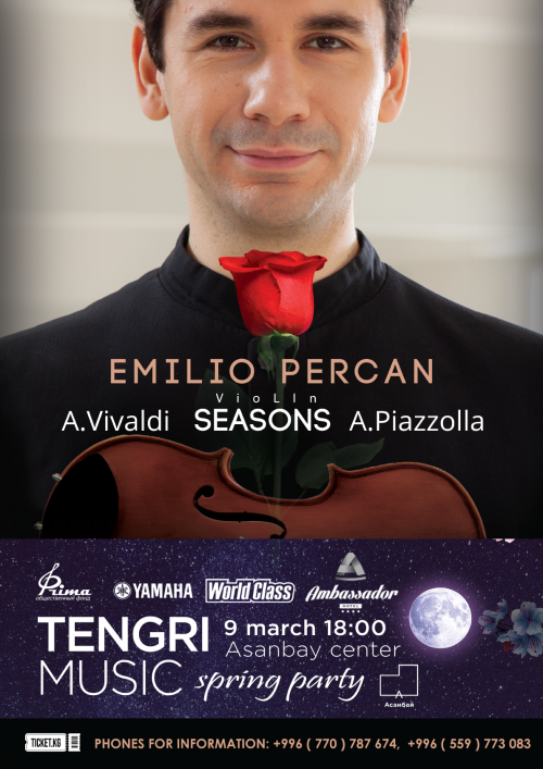 In the 4 branches of the event, Antonio Vivaldi and Astor Piazzolla will perform "The Seasons" performed by the outstanding German violinist, the exclusive soloist of the recording company "Onyx Classics", Professor of the University of Music and Performing Arts in Austria, Emilio Percan, the presidential chamber orchestra "Manas" and the masterpiece and the spanish guitar music performed by one of the most famous guitarists in the world Rovshan Mamedkuliev from Moscow. At the end of the evening - jazz jam session.