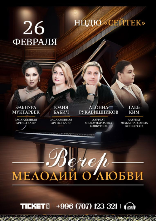 «Вечер мелодий о любви» — это романтичный концерт, посвящённый прекрасному чувству любви. В программе звучат самые трогательные и известные произведения классической и современной музыки, наполненные эмоциями и нежностью. Зрителей ждут шедевры, которые вдохновляют на размышления о любви, страсти и верности. Этот вечер подарит атмосферу уюта и красоты, погружая в мир мелодичных гармоний и ярких чувств.