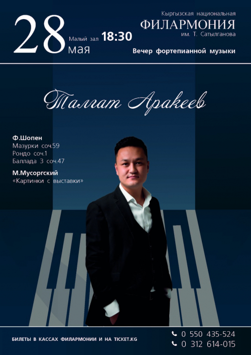 28 мая, в 18.30, в Малом зале Кыргызской национальной филармонии им. Т.Сатылганова состоится сольный концерт Талгата Аракеева.