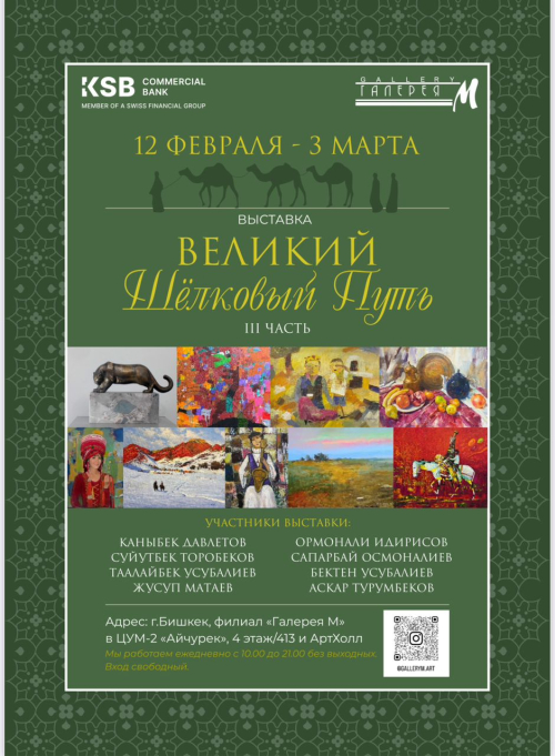 В продолжение успешных выставок 2019 и 2021 гг. мы рады объявить о третьей части художественного проекта «Великий шелковый путь» с участием известных художников Кыргызской Республики: Суйутбека Торобекова, Бектена Усубалиева, Таалайбека Усубалиева, Ормонали Идирисова, Жусупа Матаева, Сапарбая Осмоналиева, Каныбека Давлетова и скульптора Аскара Турумбекова. В экспозиции будут представлены более 60 произведений разных жанров.