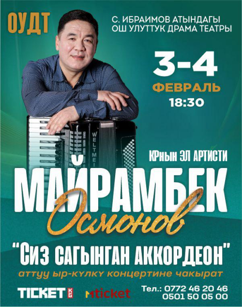 сиздерди «Сиз сагынган аккордеон» аттуу өзгөчө ыр-күлкү концерттик программасына чакырат.