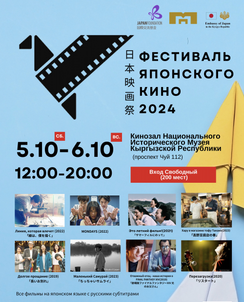 С 25 сентября по 6 октября 2024 года Посольство Японии в Кыргызской Республике совместно с Японским фондом организует «Фестиваль Японского Кино» в рамках ежегодного осеннего мероприятия знакомства с японской культурой «JAPAN MONTH».